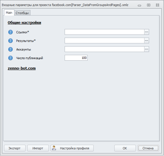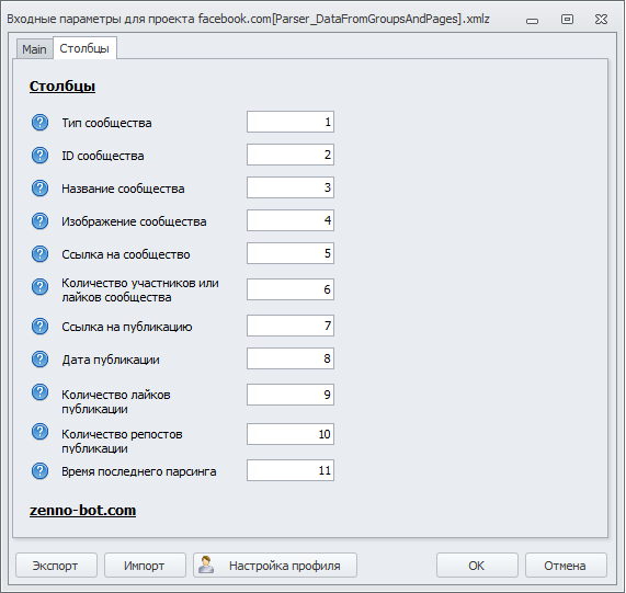 Настройки парсера новых постов Facebook: