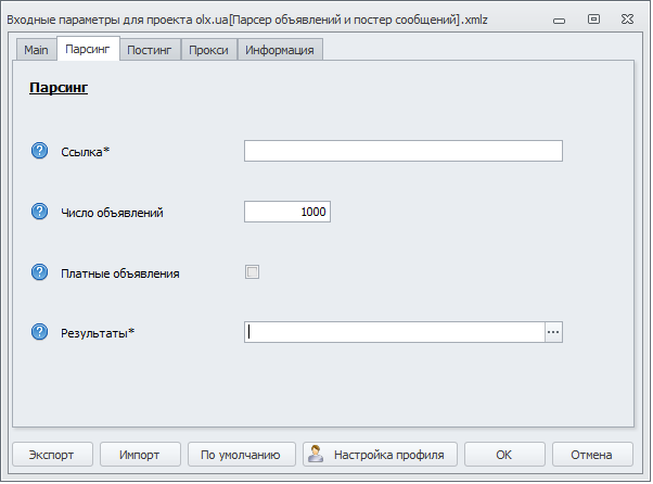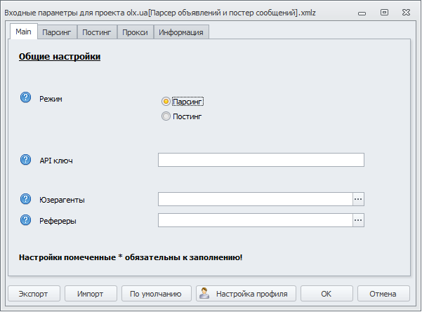 Основная настройка - это режим работы, парсинг или постинг в OLX.