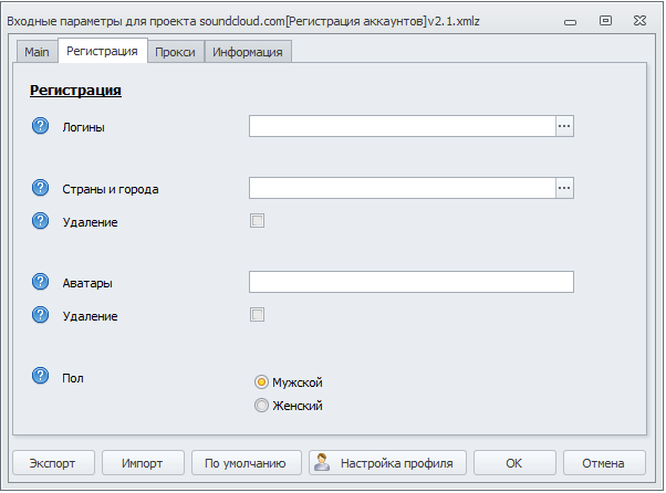 По желанию можно выбрать свой файл с  Юзерагентами, список своих логинов (если не указан, логины генерируются), страна и город регистрации аккаунта(допустимо большой список), ставить аватары или нет (указывается папка), пол аккаунта.